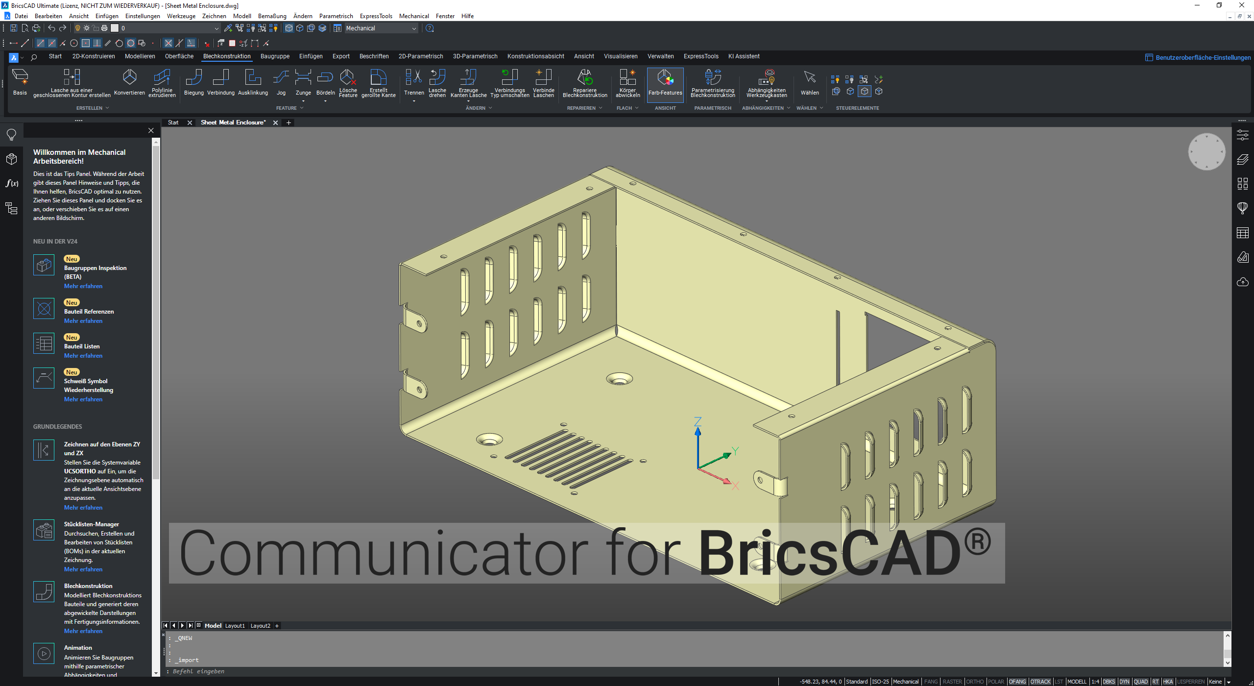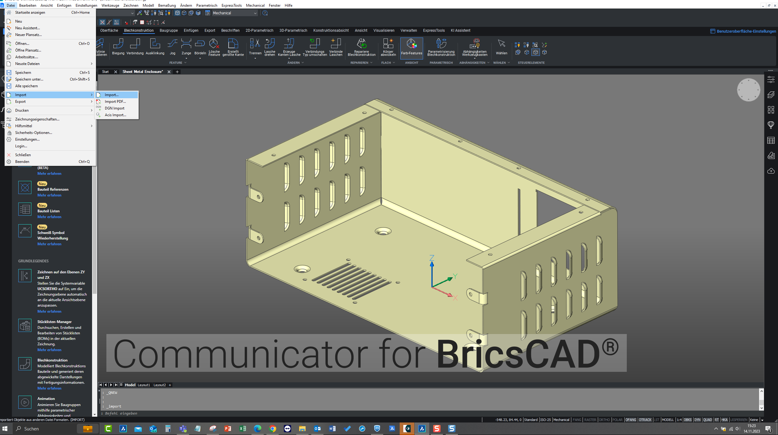 Der BricsCAD® Communicator ist ein optionales Modul für BricsCAD® Pro, BIM Mechanical und Ultimate und ermöglicht Unterstützung für hochwertigen 3D-Datenaustausch zwischen gängigen CAD-Formaten. Er erleichtert den Import und Export von 3D-CAD-Daten, einschließlich neutralen (z.B. STEP und IGES), nativen MCAD (zB CATIA, Inventor, SolidWorks) und Kernel-spezifischen Formaten.